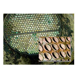 故障现象:海水面管板腐蚀析碳,将管板清干净,发现很长一截铜管裸露在外。